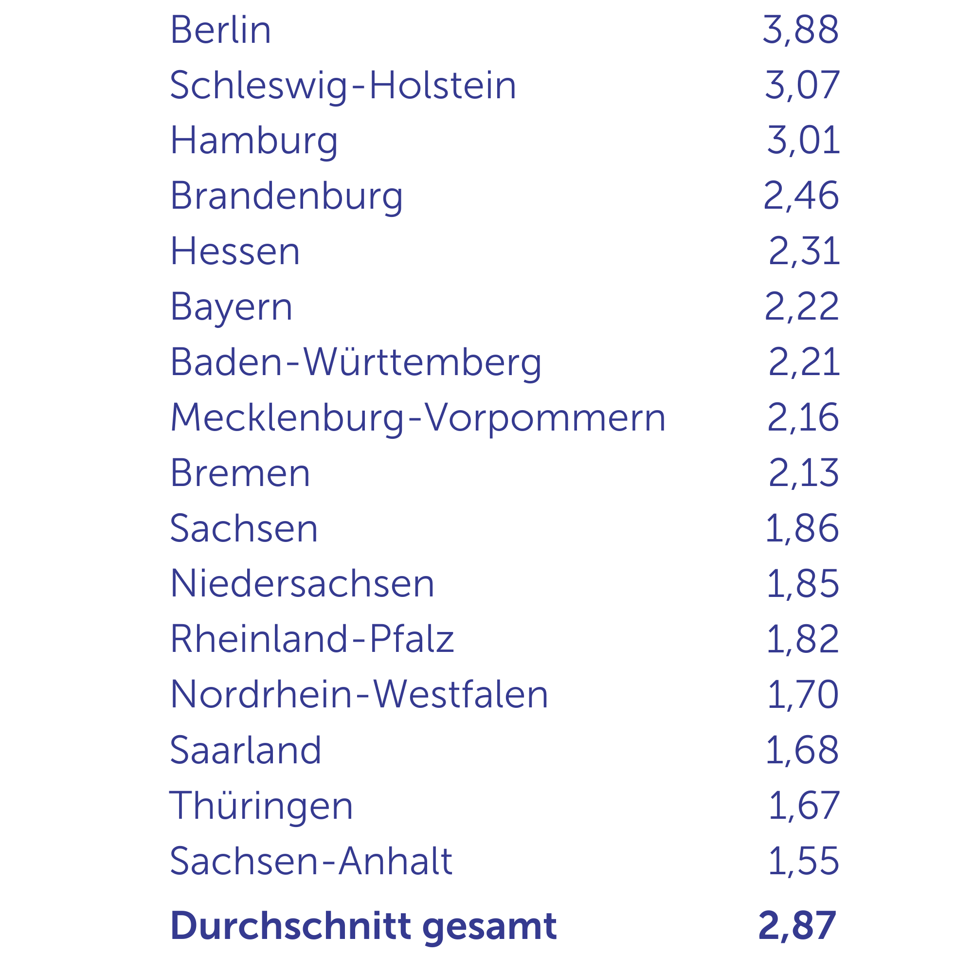 - Rheinland-Pfalz liegt mit 1,82 im unteren Bereich – hier hätte man vielleicht mehr erwartet.