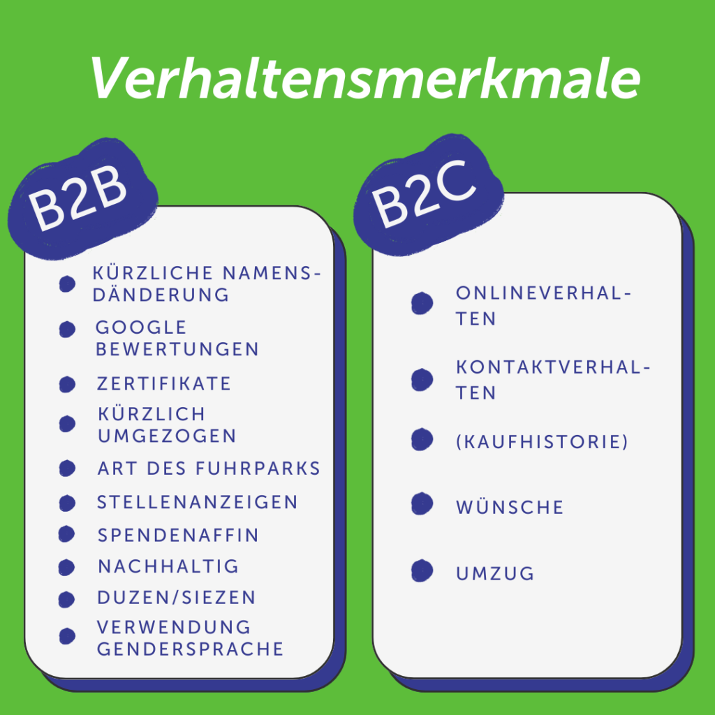 • Mitarbeitermerkmale: Hier findet sich in verschiedenen öffentlich zugänglichen Quellen Hinweise auf passende Ansprechpartner (DSGVO-konform natürlich!)