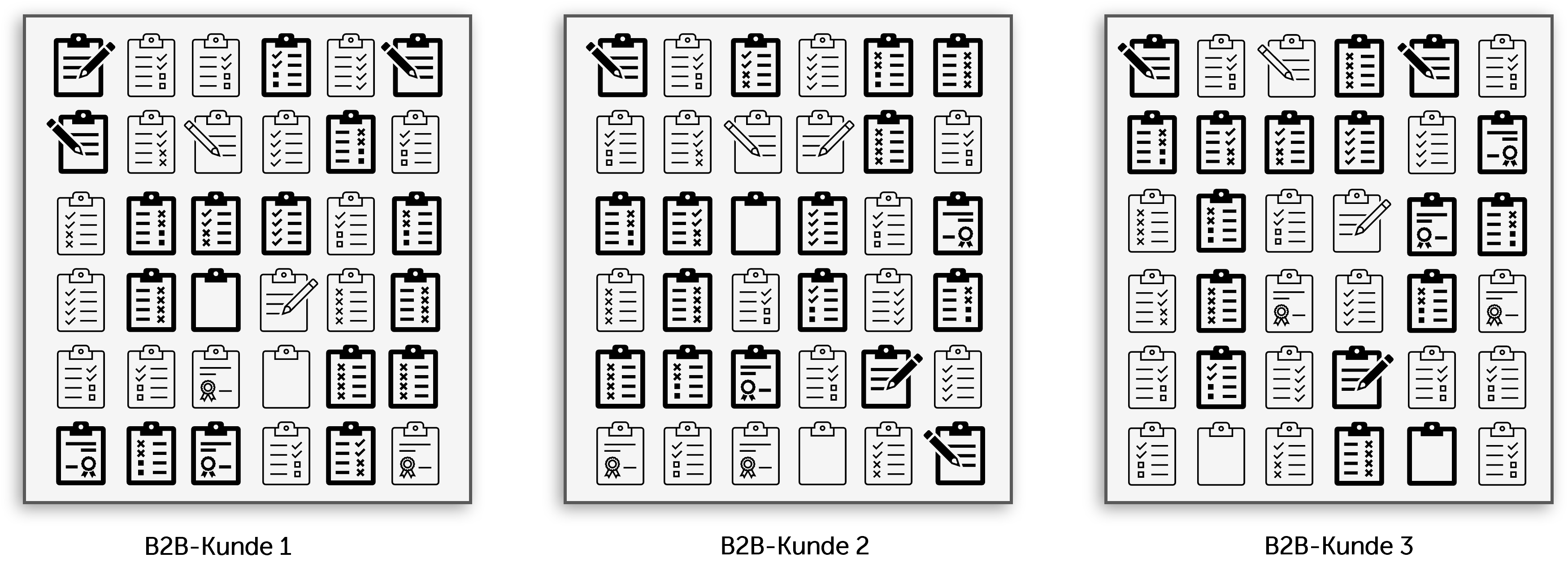 Ihre Aufgabe ist es jetzt bei jedem Unternehmenskunden eine identische Folge von drei unterschiedlichen Klemmbrettern zu finden.